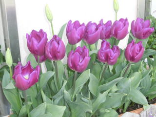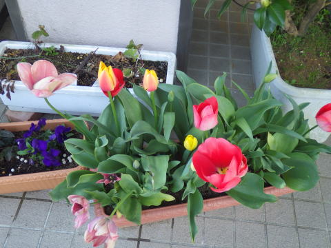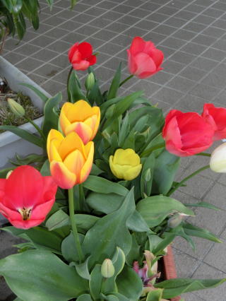 玄関前のプランターのチューリップがみんなが来るのを待っています。