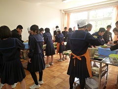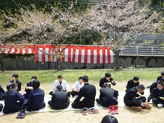 ○お花見給食(4月16日) 11日に予定していた恒例のお花見給食を、16日に行いました。とても温かい陽気の中、運動場で全校生徒が和やかに給食を食べることができました。 |