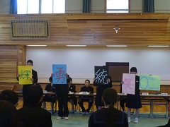 ○前期生徒総会(4月22日) 6限目の時間帯に、全校生徒が体育館に集まって、前期生徒総会を行いました。 この総会までに、生徒会の各専門委員会で今年度の活動計画の立案、生徒会役員と各学年の代議員が集まっての生徒議会での審議、生徒会役員による議案書の作成、各学年での議案書の議件に関するクラス討議で準備を進めてきました。 各学年からの多くの質問、生徒会役員からの応答の後、全ての議案が議決されました。 |