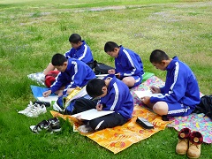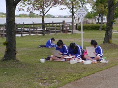 ○木場潟写生会(5月2日) 全校生徒が木場潟公園中央園地まで自転車で移動して、写生会を行いました。 朝方までぐずついた天候でしたが、昼前には日も差してきたなかで、思い思いに筆を走らせていました。 |