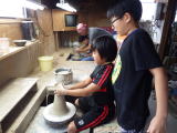 花坂町のギャラリーワタルに移動して絵付けとろくろの体験をしました。みんな夢中になっていました。